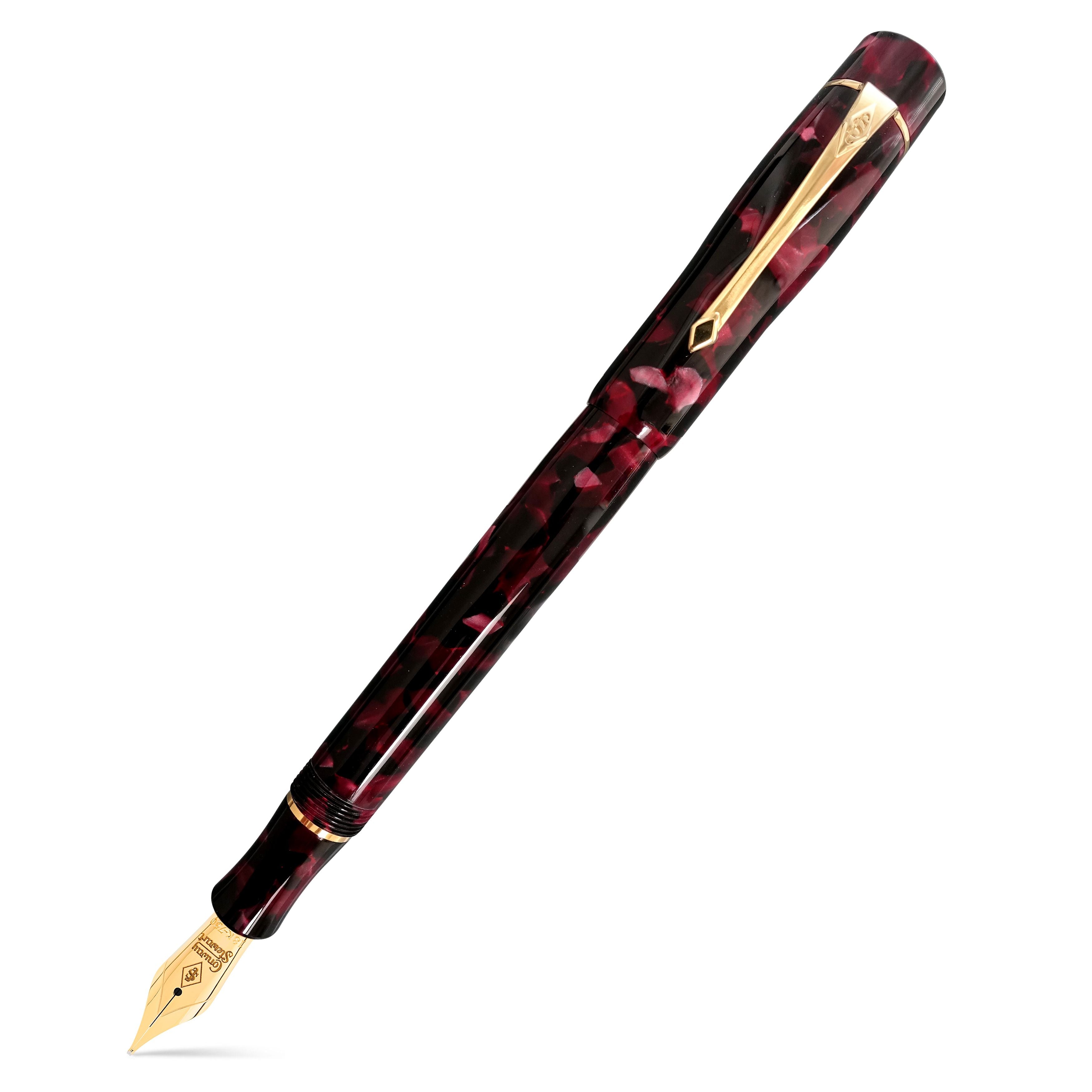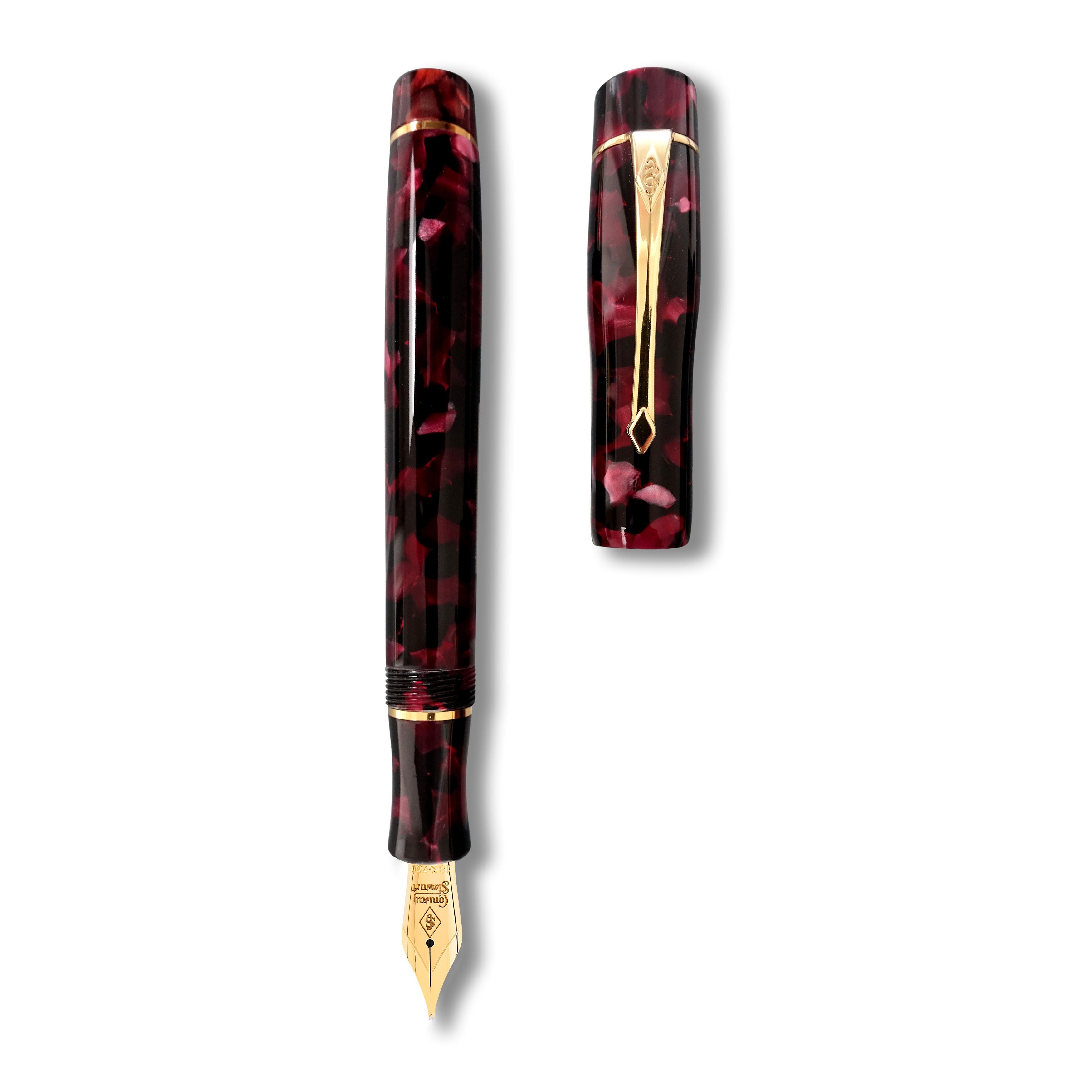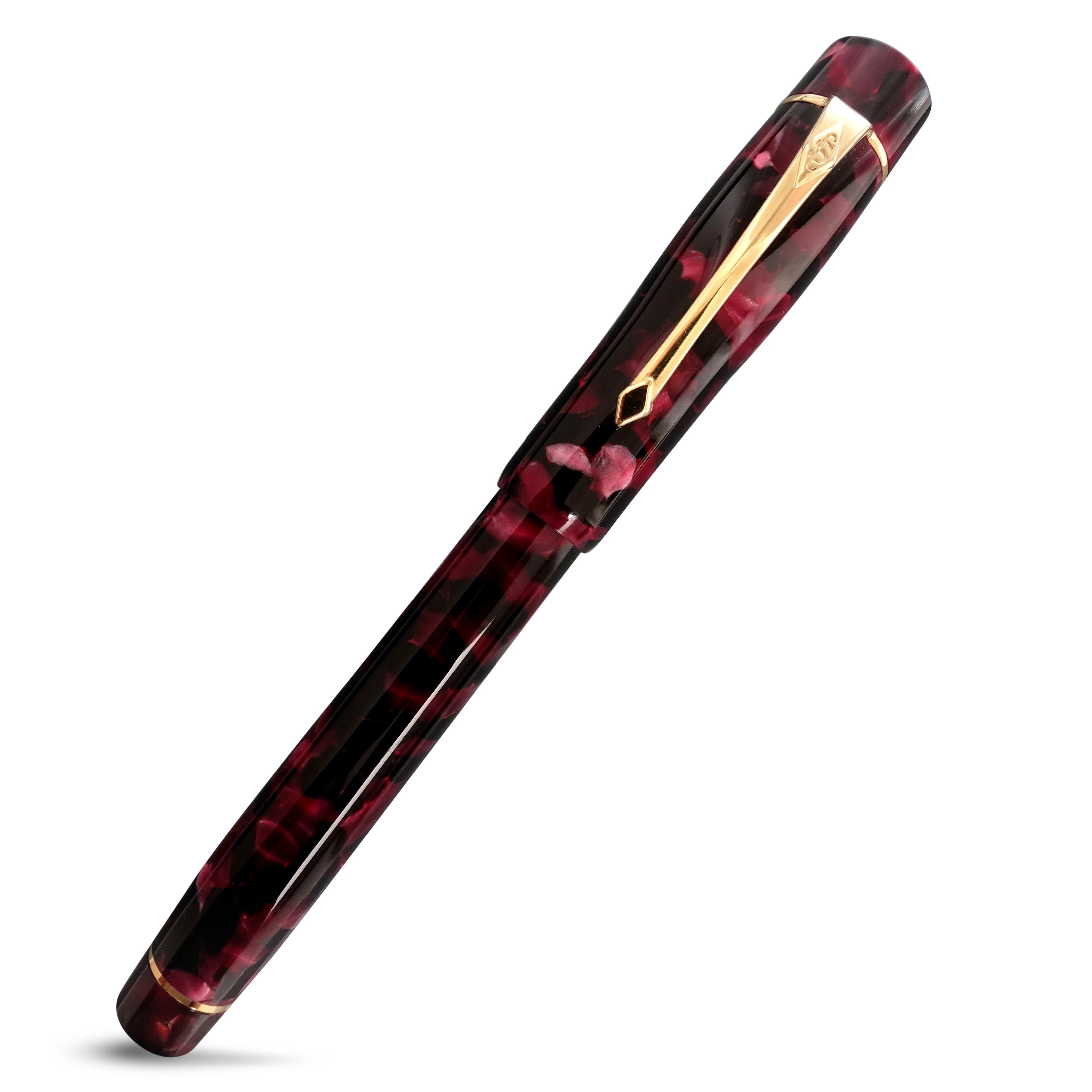 The Conway Stewart Wellington Classic Claret is a beautifully designed pen with a subtle and curvaceous form, providing comfort during extended use. Crafted with the exquisite Classic Claret acrylic, this pen exudes a classic and contemporary appeal. The burgundy background, reminiscent of fine claret, with black and pearlescent shapes creates an overall finish that's both subtle and elegant. Each pen is unique due to the complexity of the colour mix. This exclusive pen is available as a Fountain Pen with a choice of Fine, Medium or Broad 18ct gold Flag nibs and comes in a Conway Stewart black leather presentation box, which also serves as a showcase pen stand for your desk. Only 5 of these pens are available, making them a highly collectible item.