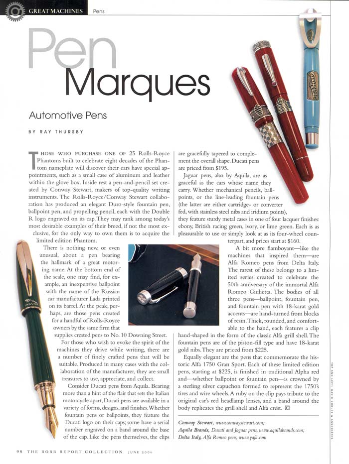 There is nothing new, or even unusual, about a pen bearing the hallmark of a great motoring name. At the bottom end of the scale, one may find, for example, an inexpensive ballpoint with the name of the Russian car manufacturer Lada printed on its barrel. At the peak, perhaps, are those pens created for a handful of Rolls-Royce owners by the same firm that