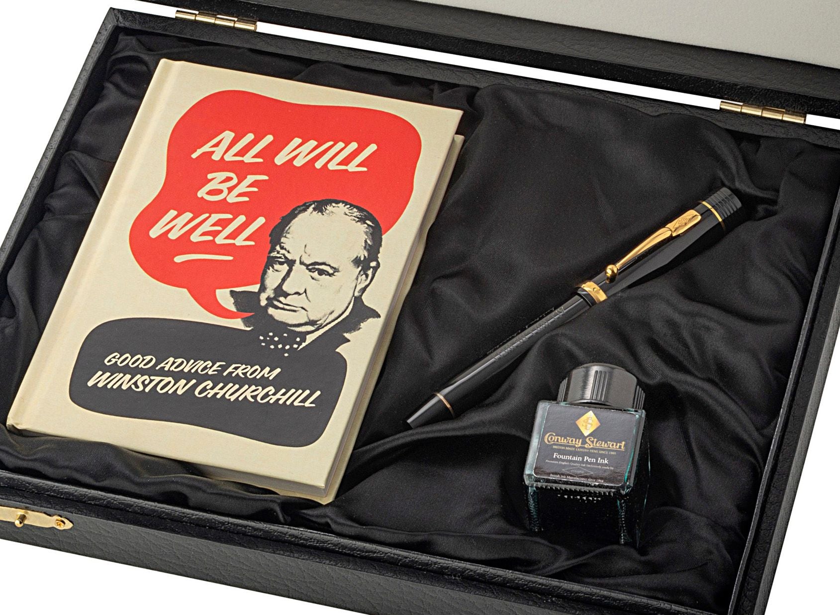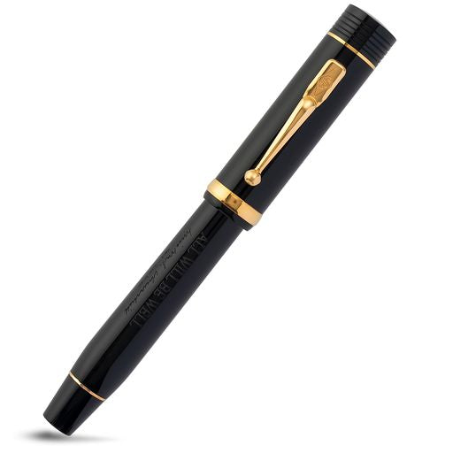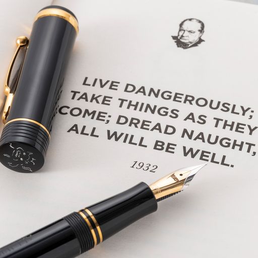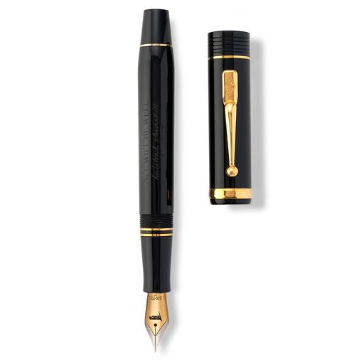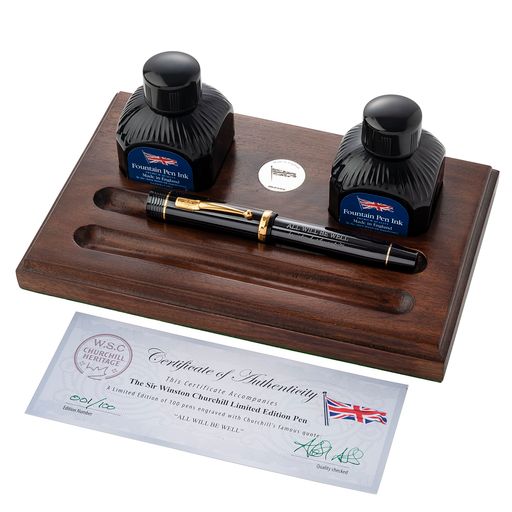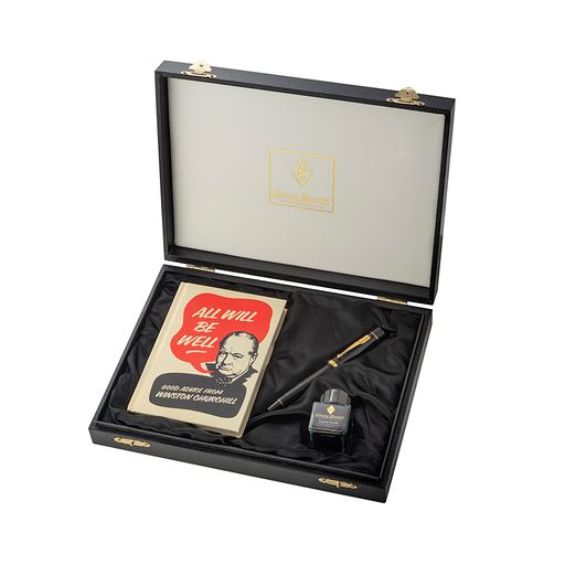 The Conway Stewart Churchill Heritage 'All Will Be Well' pen is the first in a series of pens produced in association with Churchill Heritage. Each pen features a famous quote from Winston Churchill, and up to 20% of every pen sold goes to support charities that keep Churchill's legacy alive. The pen comes in Classic Black and 9ct Gold trim, and features Churchill's signature and the phrase "ALL WILL BE WELL" on the barrel. The pen comes with a book of Churchill's quotes, a bottle of green ink, and a replica of one of Churchill's Red Cabinet Boxes. Only 100 pens will be made of each quote in the series, and each pen comes with a certificate detailing the edition number. Available as a rollerball or fountain pen with an 18ct gold Flag nib.