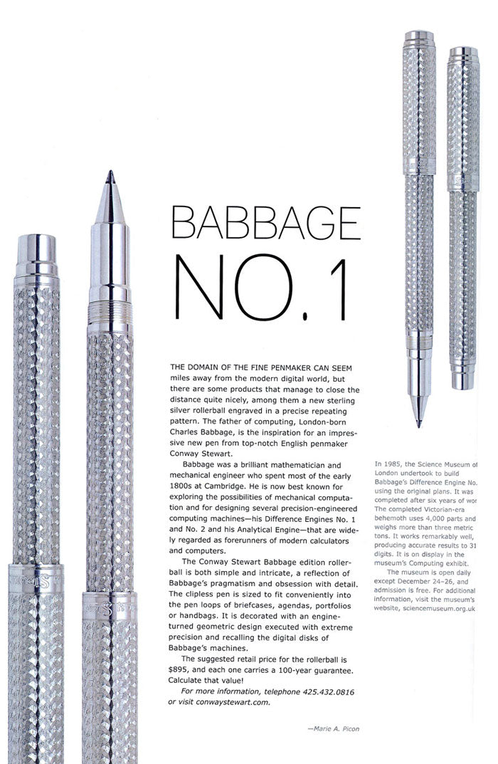 LE DOMAINE DU FINE PENMAKER PEUT SEMBLER à des kilomètres du monde numérique moderne, mais certains produits parviennent à réduire assez bien la distance, parmi lesquels un nouveau roller en argent sterling gravé dans un motif répétitif précis. Le père de l'informatique, né à Londres, Charles Babbage, est l'inspiration pour un nouveau stylo impressionnant du fabricant de stylos anglais de premier ordre Conway Stewart.