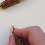 La Conway Stewart Serie 58 tiene el plumín n.° 5; es un plumín ligeramente más pequeño que el de la gama Churchill/Winston, pero aun así es un placer usarlo. El plumín n.° 5 está disponible en acabado monocromático dorado en extrafino, fino, medio y ancho. El fino es de oro de 18 quilates, mientras que los demás anchos solo están disponibles en oro de 14 quilates.