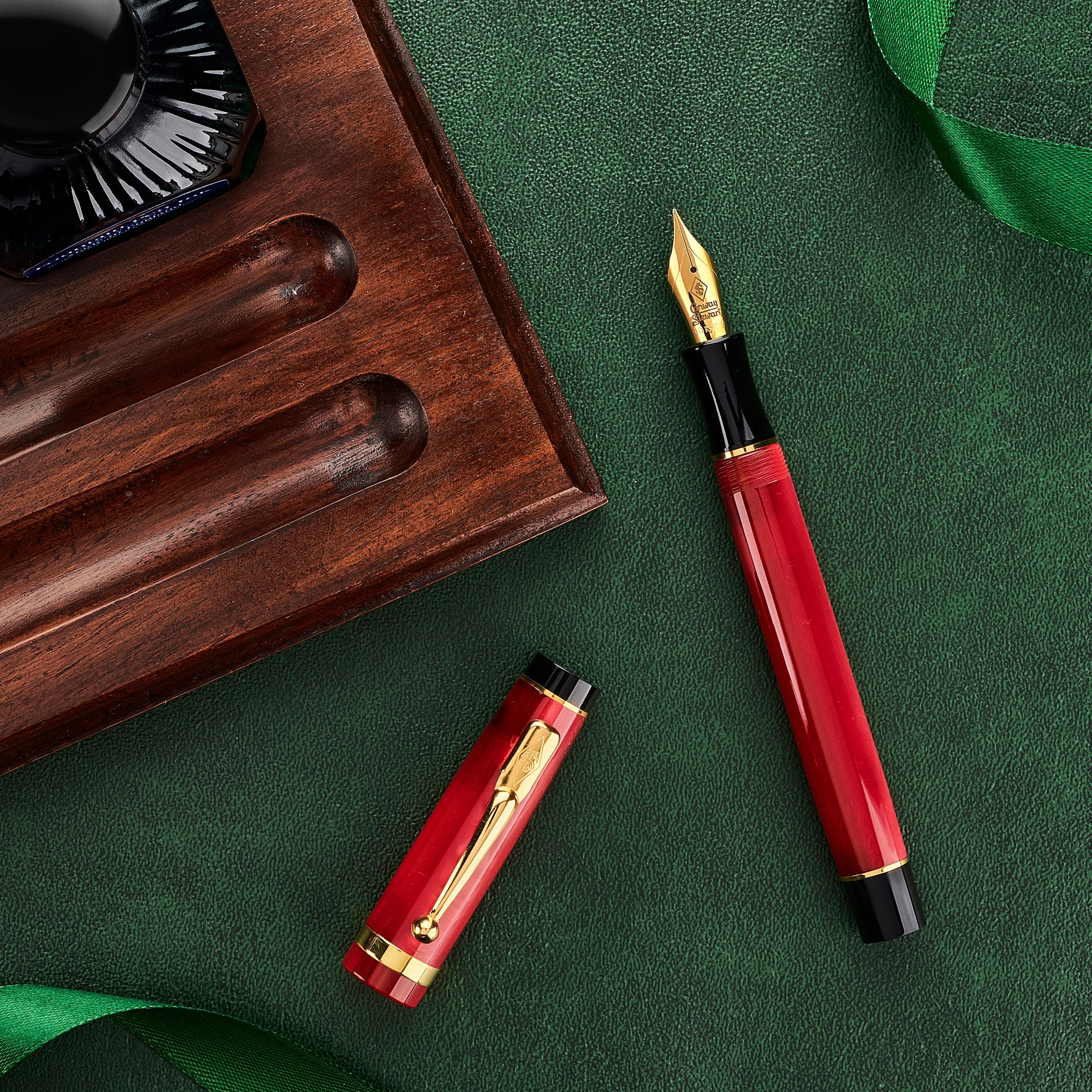 コンウェイ・スチュワートの 2013 年モンタギューとキャピュレット シリーズは、シェイクスピアの永遠の古典『ロミオとジュリエット』の主要登場人物を称え、優雅でエレガントなスリムなデザインを手に命を吹き込みます。 オリジナルのスターリングシルバーのバベッジ モデルをベースにしたこれらのペンは、キャップ、バレル、グリップ部分にハンドキャストされたアクリル樹脂の構造を特徴としています。キャピュレットには、カーディナル レッド、カッパー ブロンズ、エバーグリーン、ラベンダー、シー グリーンの 5 つの新しい鮮やかな仕上げがあり、モンタギューは、優雅なギョーシェ スタイルの彫刻が施された輝くクラシック ブラックで作られています。 これらのペンは、コンウェイ・スチュワート コレクションを日常の実用性の新たなレベルに引き上げ続けており、そのスリムなラインと完璧にバランスのとれた軽さにより、今日の忙しいライフスタイルに見事にフィットします。 システム手帳やブリーフケースとして実用的です。モンタギューとキャピュレットは、あらゆるエグゼクティブや高級筆記具の愛好家にとって完璧なアクセサリーです。 手になじみやすいデザインでありながら、機能性とエレガントさを兼ね備えた新シリーズです。万年筆バージョンには、エクストラ ファインからエクストラ ブロード、イタリック ファイン、イタリック ミディアム、イタリック ブロードまで 8 つのペン先グレードからお選びいただける大型の 18 カラット ソリッド ゴールド ペン先が取り付けられており、信頼性が高く使いやすいカートリッジ コンバーター...