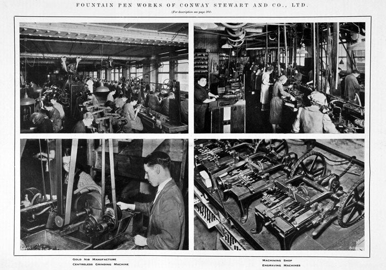 1905 年,22 岁的弗兰克·贾维斯 (Frank Jarvis) 和 28 岁的霍华德·加纳 (Howard Garner) 在伦敦圣保罗大教堂旁边的帕特诺斯特街 13 号成立了康威·斯图尔特公司 (Conway Stewart & Co.)。如今,该地区被称为帕特诺斯特广场,在第二次世界大战的闪电战中被彻底摧毁后经过重新开发。尽管关于公司名称的起源存在很多争议,但人们相信“Conway Stewart”这个名字源自当时流行的歌舞杂耍表演。这两位企业家最初销售从美国进口的钢笔,但很快就成长为最大的钢笔制造商之一。二战前,康威·斯图尔特 (Conway Stewart) 在英国生产和销售的钢笔数量可能比其主要竞争对手马比·托德 (Mabie Todd)、德拉鲁 (De La Rue)、派克 (Parker) 和沃特曼 (Waterman) 的销量总和还要多。